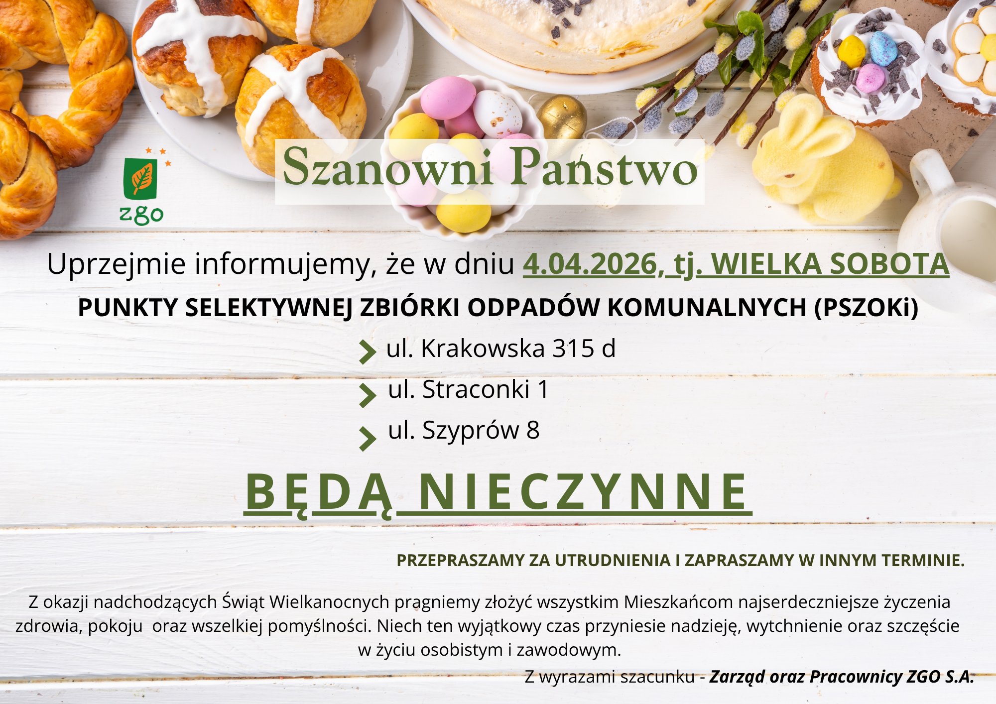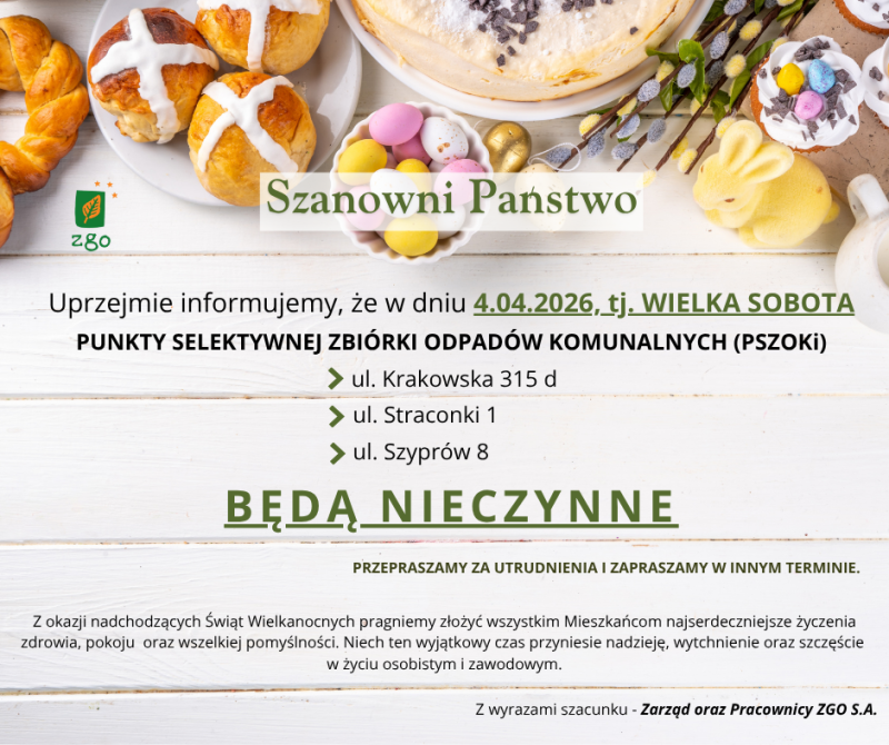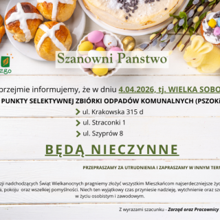 Szanowni Państwo. Uprzejmie informujemy o zmianach w obsłudze Klientów PSZOK w okresie świątecznym.