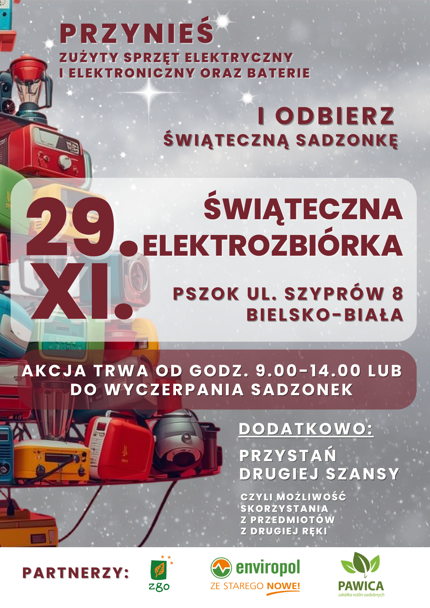W dniu 29.11.2025r. odwiedź PSZOK przy ul. Szyprów 8 w Bielsku-Białej i oddaj zepsuty i zużyty sprzęt elektryczny i elektroniczny, baterie, kable, ładowarki, telefony, telewizory, itp…